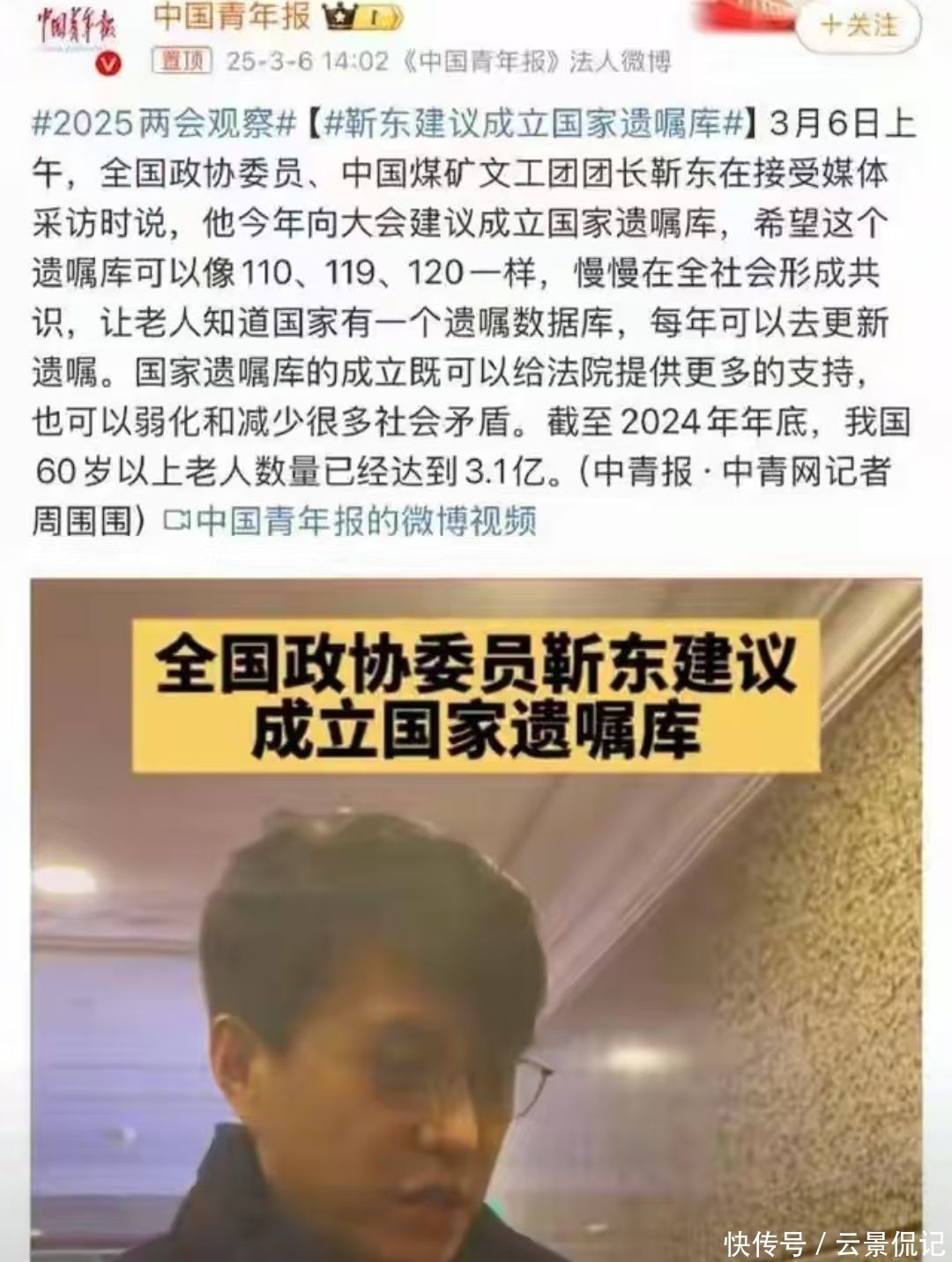 38. 此外,2025年他还当选为全国政协委员,提交了关于建立“国家遗嘱库”的提案,