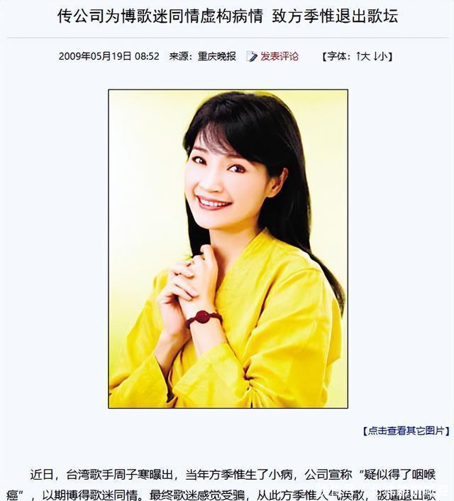 “惨遭公司背刺” 1992年,26岁的方季惟被诊断出甲状腺滤泡癌。 这个消息让她瞬间陷入绝望,可更让她心寒的还是公司的态度。 公司不仅没有安排她好好治疗,反而借着她的病情大肆炒作,立马宣布要办“告别演唱会”。